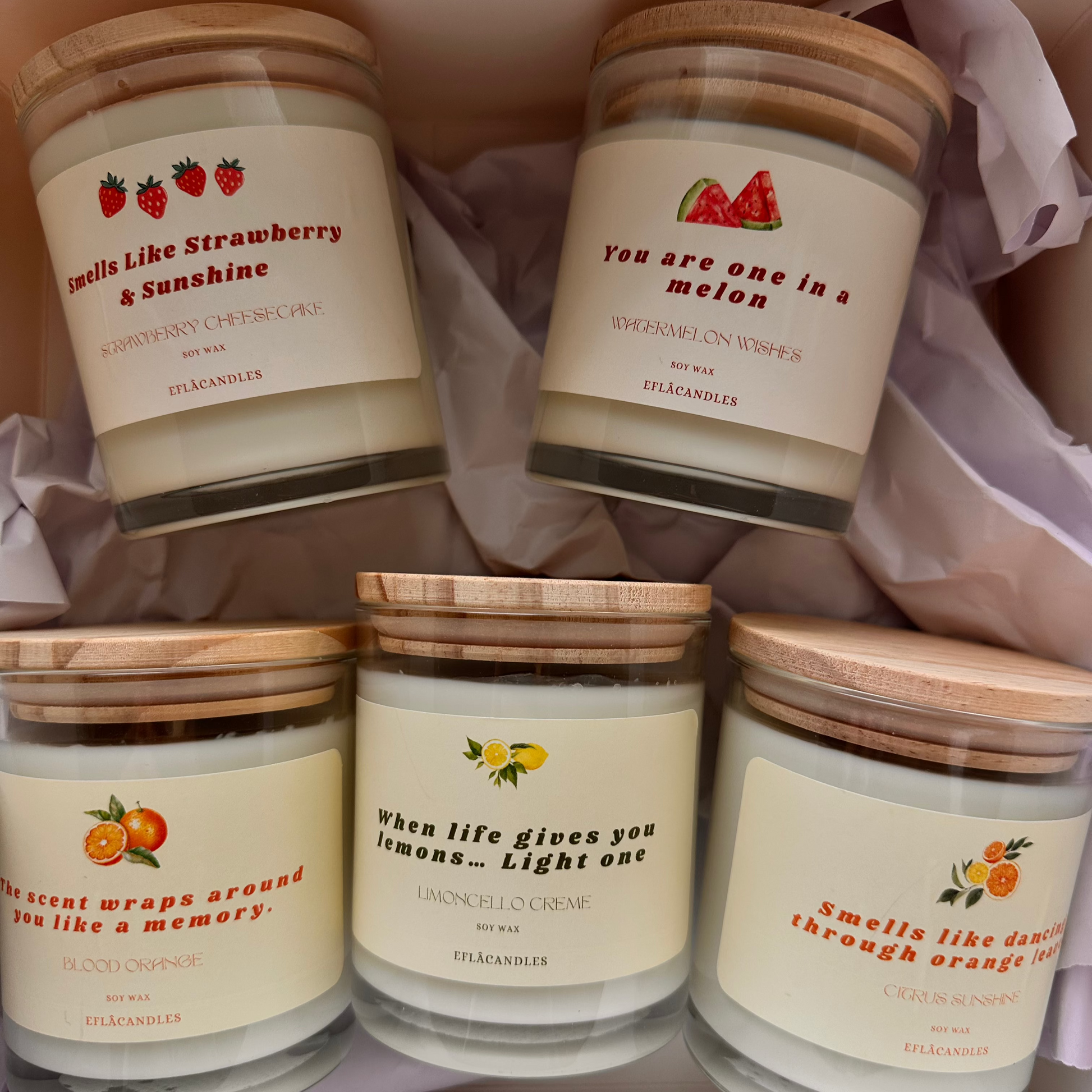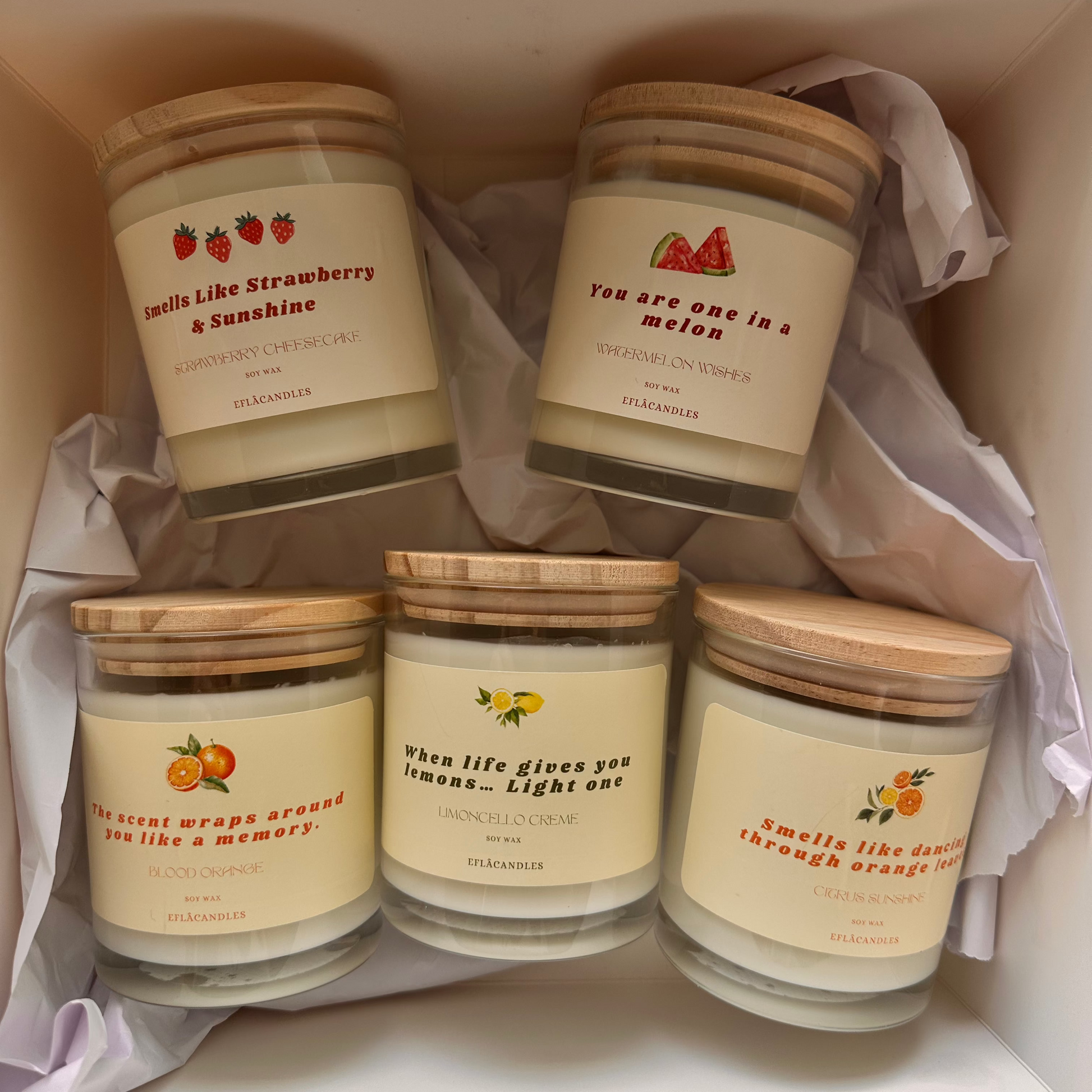 Bring the sunshine home with Summer in a Box—a vibrant collection of five handmade candles inspired by the sweetest scents of the season. Each candle is poured with natural soy wax into our signature jars and carefully chosen to capture everything we love about summer: think juicy fruits, fresh blooms, and warm breezy evenings.